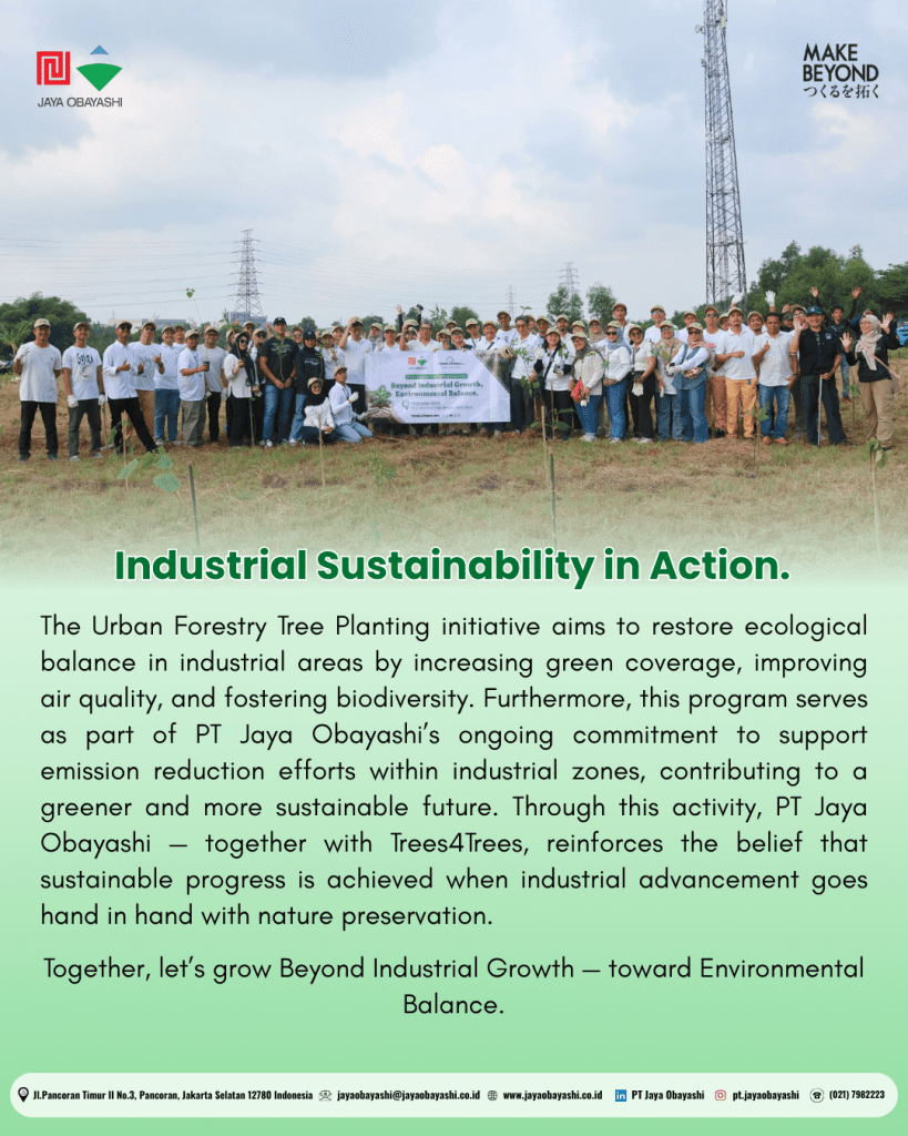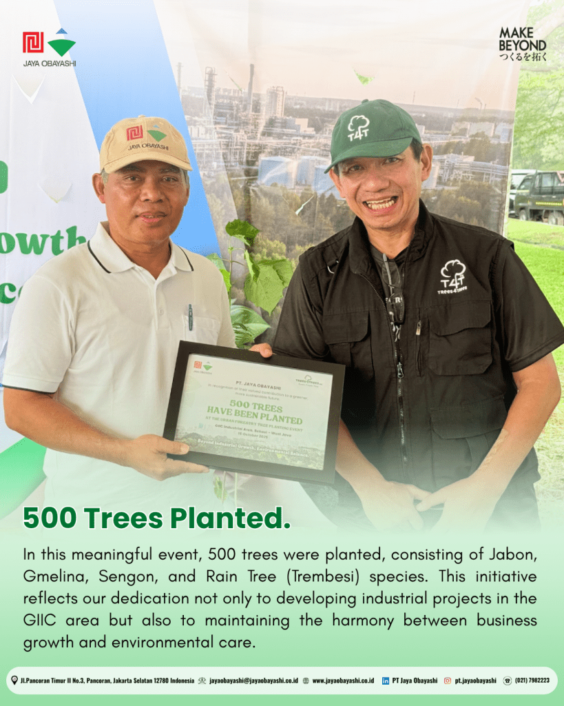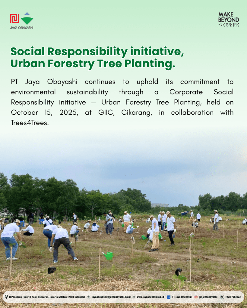 PT Jaya Obayashi strengthens its commitment to sustainability through the Urban Forestry Tree Planting CSR event, held on October 15, 2025, at GIIC, Cikarang.