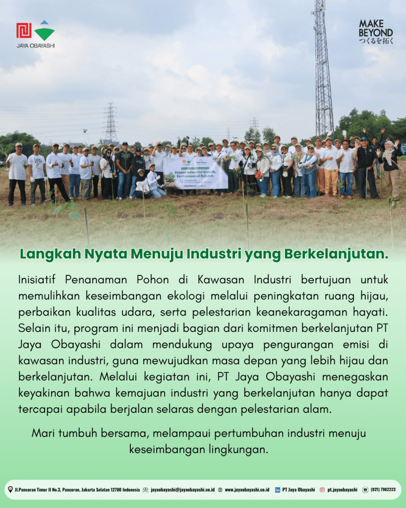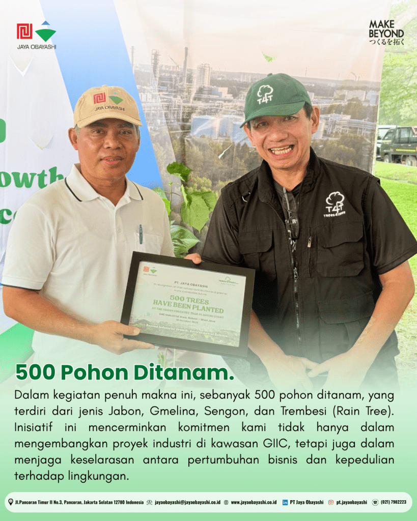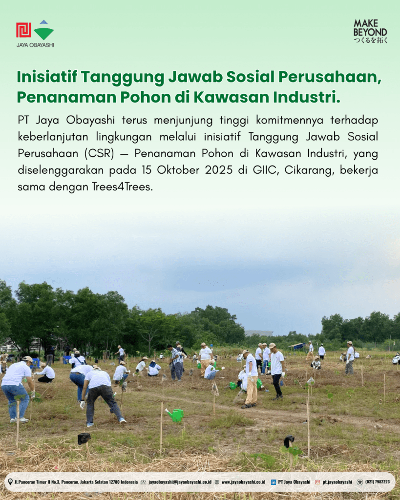 PT Jaya Obayashi memperkuat komitmennya terhadap keberlanjutan melalui kegiatan CSR Penanaman Pohon Urban Forestry yang diselenggarakan pada 15 Oktober 2025 di GIIC, Cikarang.
